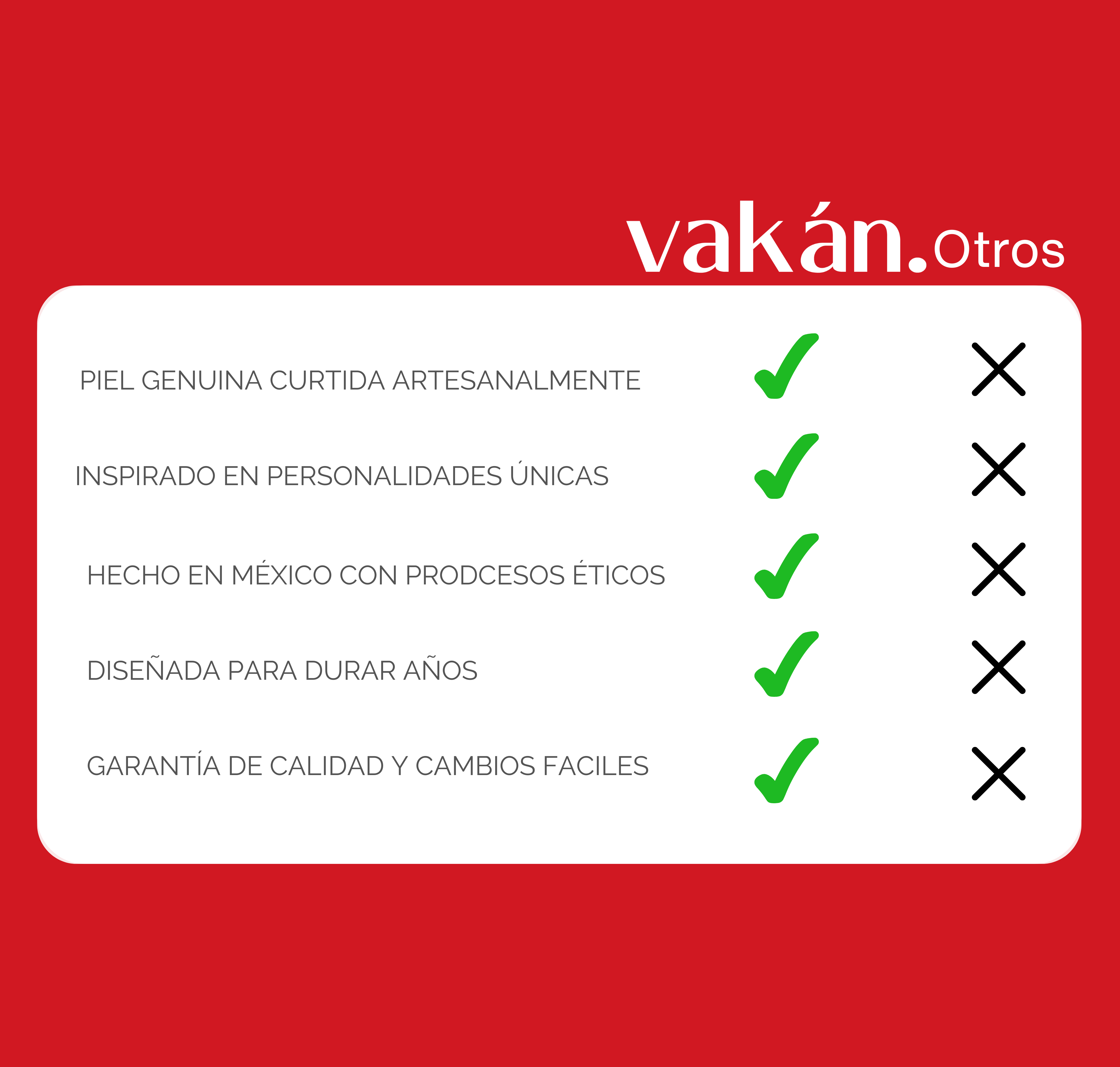 Apostamos por lo auténtico: piel genuina, diseño con carácter y procesos conscientes. Comparado con otros ofrecemos piezas de calidad con nombre, historia y una vibra distinta — igual que tú.